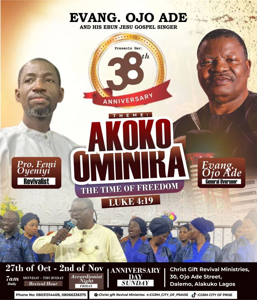 The celebration has Time of Freedom as the theme and it will be featuring early morning revival with Evangelist Emmanuel Femi Oyeniyi, from 7.00am through Monday to Thursday, 30th October, and it will be rounded off on Sunday November 2, 2025, with Thanksgiving Service.